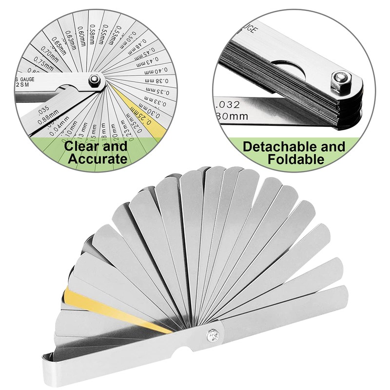 - Practical: Made of stainless steel, each measuring feeler gauge has 32 blades of thickness, a feeler gauge imperial and metric, easy and convenient to take and stock