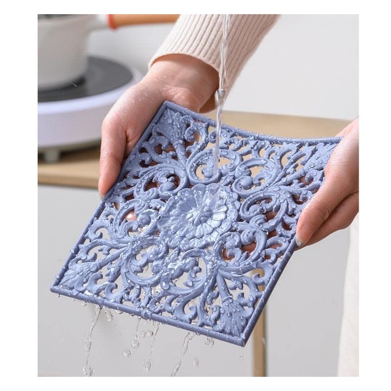 - DECORATIVE HOME AND KITCHEN - 7.09*7.09*0.2 inch teal silicone trivet mats set has 3 carving-shaped designs to decor your home, kitchen decor for counter. Great for granite and quartz countertops, kitchen counter, wood kitchen and dining tables. Practical and useful hot mats for kitchen, countertop, table but also work great to enhances the decor to your dinner room. Sufficient quantity allows you to use and replace for daily life.