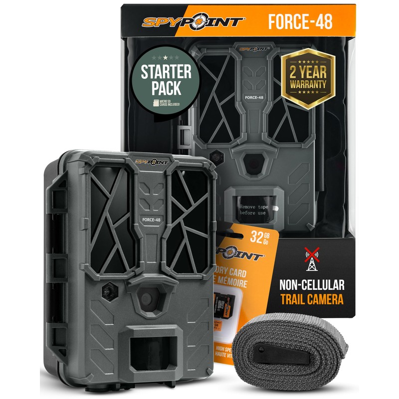 SPYPOINT FORCE-48 Starter Pack Trail Camera with SD Card, Non-Cellular, 48MP Photo 720p Video w/ 48 Low-Glow LEDs, 80’ Flash Range, 80’ Detection Range, LCD Setup Screen
