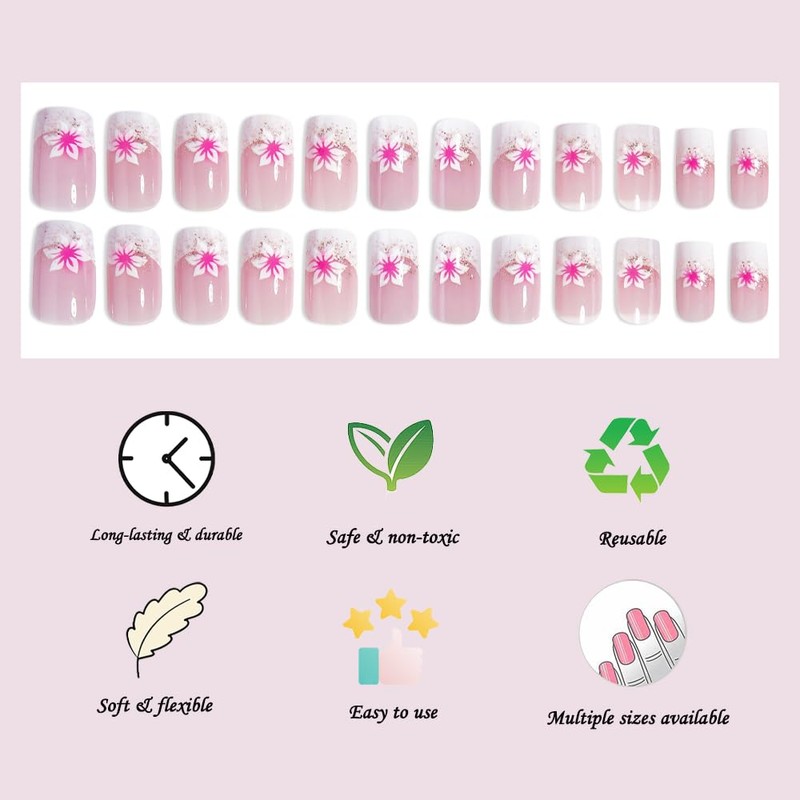 Square Ombre White Pink Press On Nails French Tip Glue On Nails Short Medium Fake Nails With Pink Flower Designs For Women Cute False Nails Diy Full Cover Stick On Nails For Wedding Birthday 24pcs