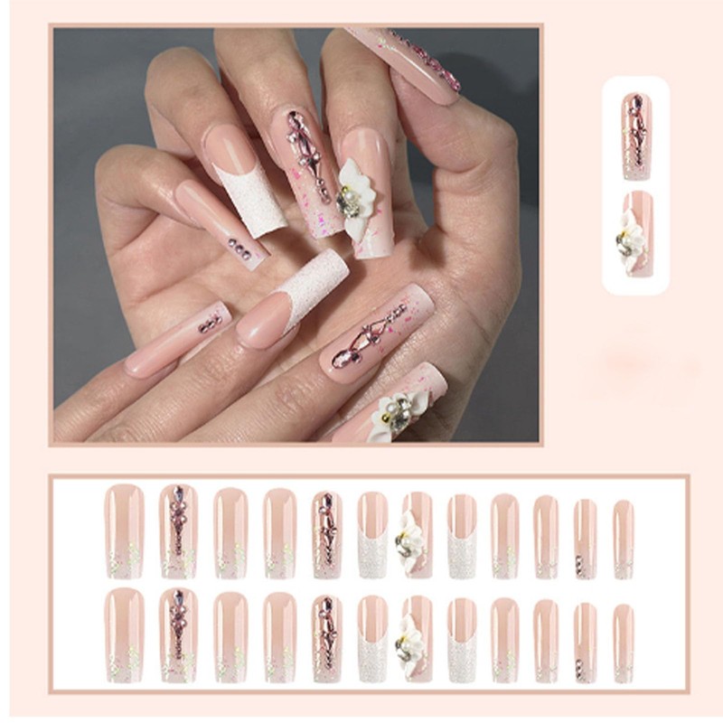 Square Press on Nails Long Fake Nails Glue on Nails,24 Pcs French Tip Square Press on Nails with Rhinestones&Peal&Glitter Snake.Squoval Manicure Artificial False Nails (Pink Rhinestones, L)