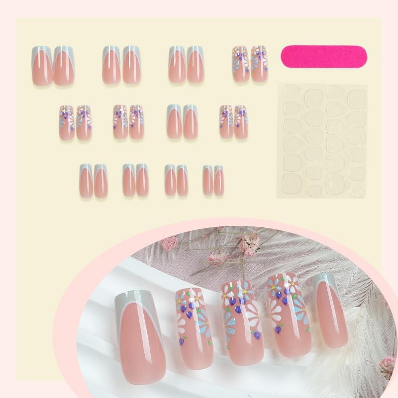 Square Press on Nails Medium Fake Nails French Tip False Nails White Artificial Nails with Blue Flowers Designs Stick on Nails for Women 24pcs
