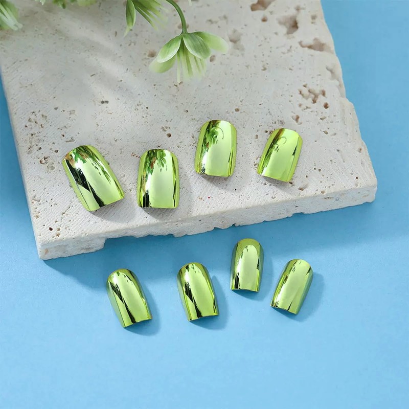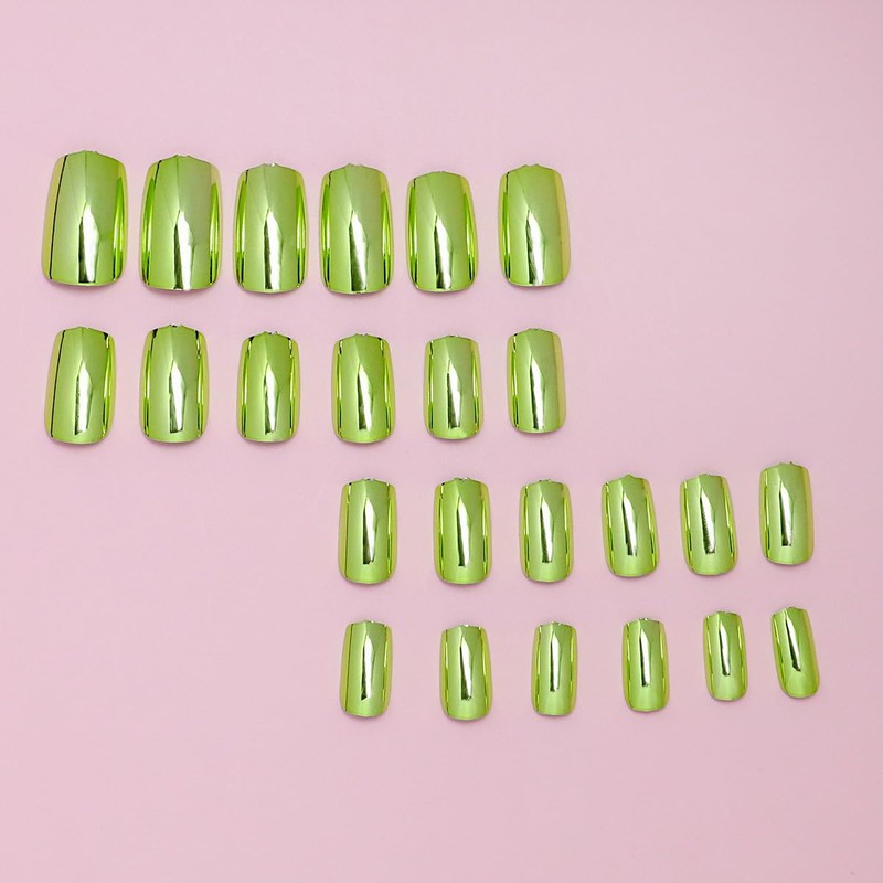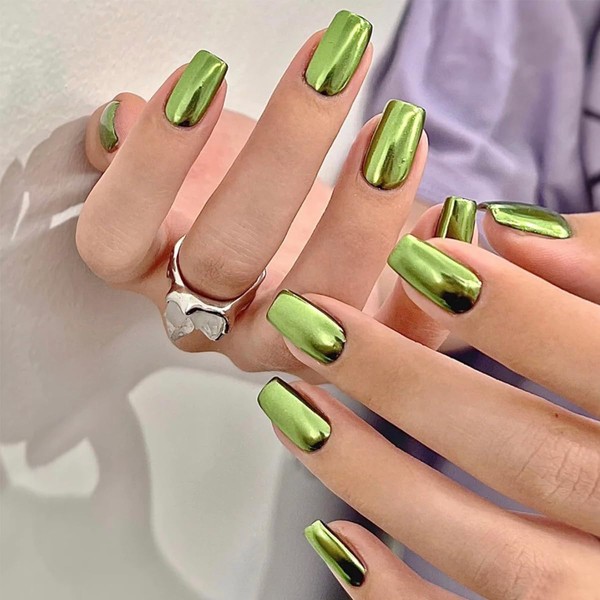 Square Press On Nails Medium Fake Nails Mirror Metal With Chrome Design Green False Nails Acrylic Nails Glossy Glue On Nails Artificial Full Cover Reusable Stick On Nails For Women Manicure 24pcs