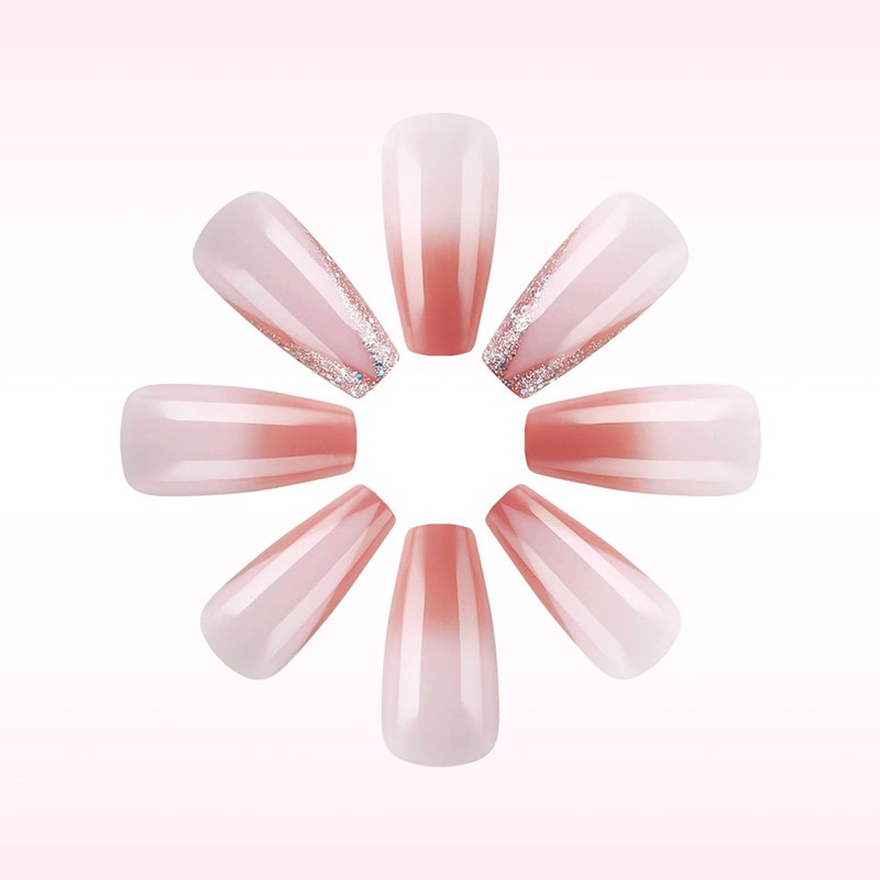 Square Press on Nails Medium False Nails Pink Ombre Fake Nails with Glitter Designs Stick on Nails Glossy Full Cover Glue on Nails Cute Artificial Nails for Women 24Pcs