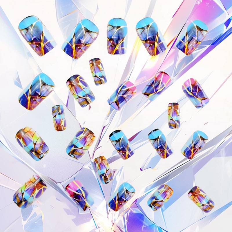 Square Press on Nails Medium Length Fake Nails with Golden Crack Designs Full Cover Glue on Nails Rainbow Colors Gradient False Nails Artificial Acrylic Press on Nails for Women 24Pcs