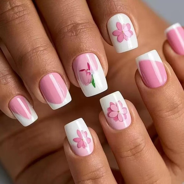 Square Press on Nails Short Fake Nails Pink False Nails White French Tip False Nails with Floral Patterns Design Glue on Nails Summer Full Cover Stick on Nails for Women Manicure 24Pcs
