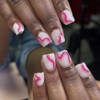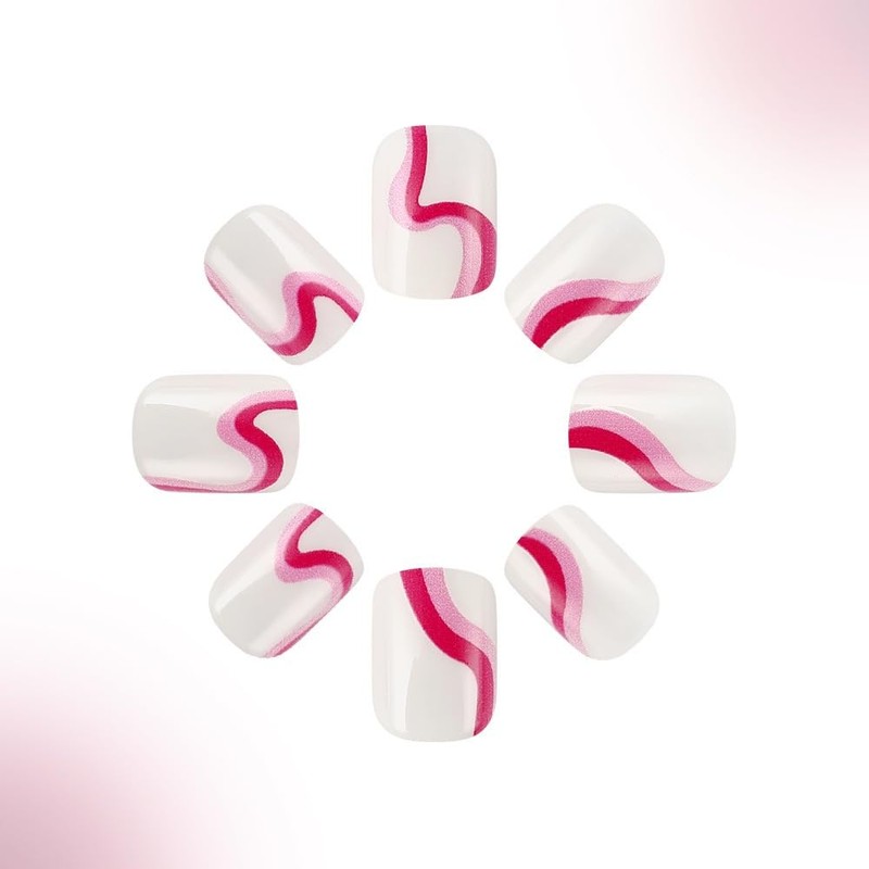 Square Press On Nails Short Fake Nails White False Nails With Pink Wave Design Summer Acrylic Nails Full Cover Artificial Nails Glue On Nails Cute Stick On Nails For Women 24pcs