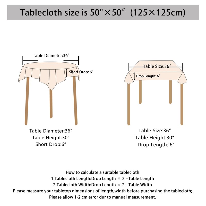 For example, if your table's diameter is 30" and you want a 8" drop. The resulting dimensions——30"+8"x2=46"——is the tablecloth size you should purchase.