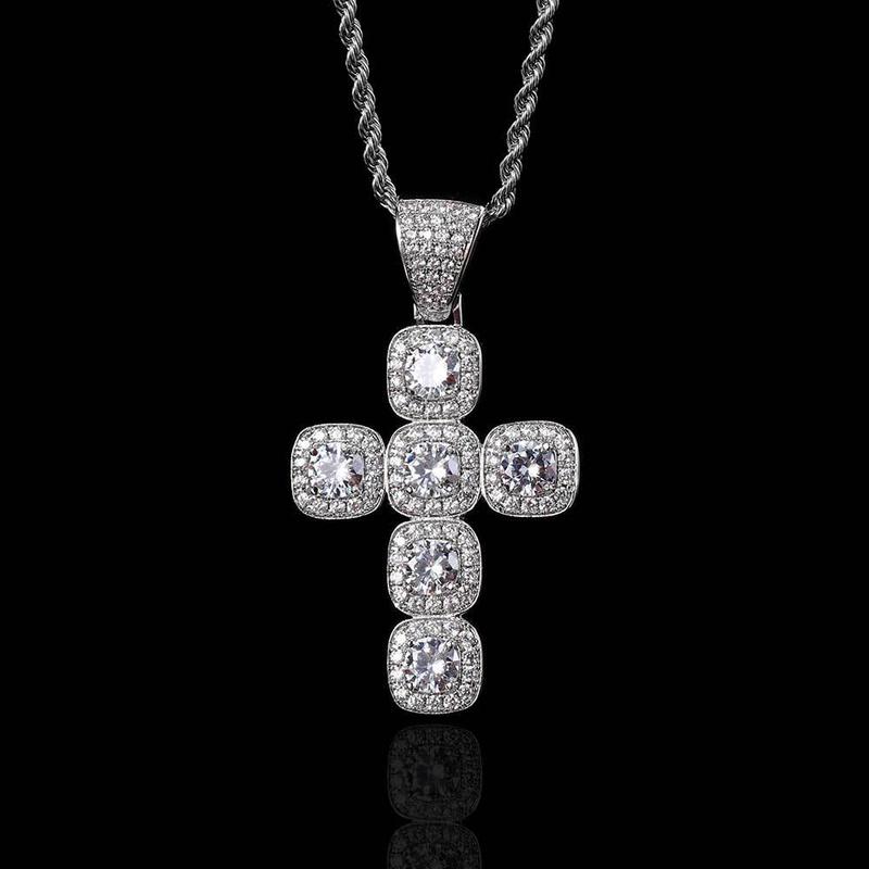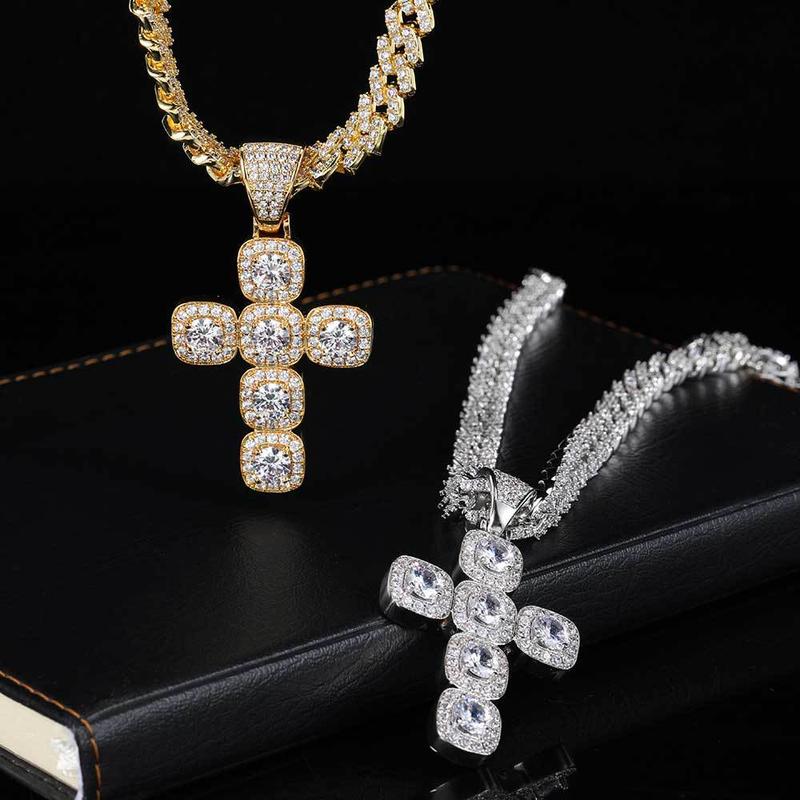 Square Sugar Cross Iced Pendant Necklace ,2 Pcs Set , ,HIP-HOP Style Cross Pendant + 24inch Necklace , - Color: Gold+24inch*3mm twist chain