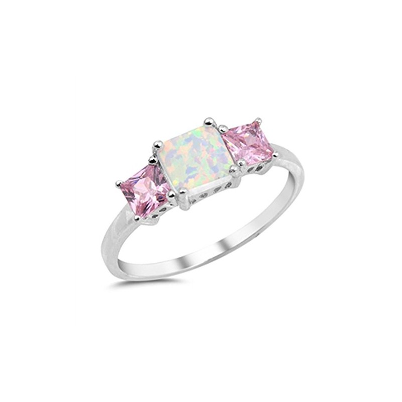 Square White Simulated Opal Pink CZ Cute Ring New .925 Sterling Silver Band Size 6