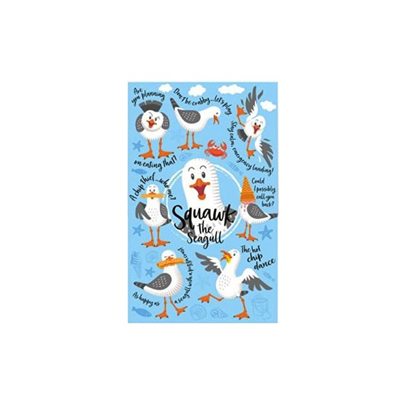 - ✅ Tea towel shows Squawk the playful seagull, vibrant blue design of squawk on his daily chip thieving escapade