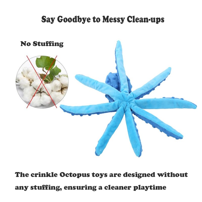 - Say goodbye to messy stuffing! These crinkle Octopus toys are designed without any stuffing, ensuring a cleaner playtime. Crafted with reinforced fabric and strong stitching, they are built to last and withstand regular chewing