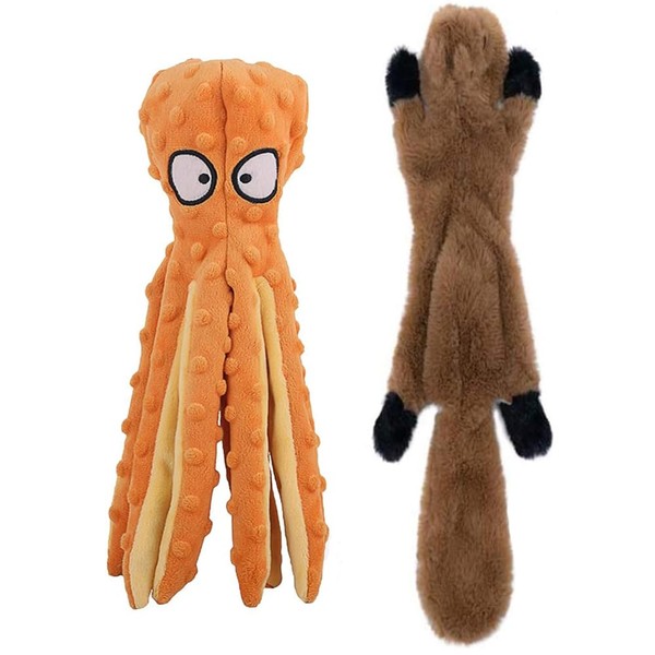 - These toys offer a stimulating play experience with a squeaker located in both the head and tail of the squirrel, as well as in the head of the octopus. Additionally, crinkle paper is integrated throughout the octopus's body. The variety of sounds is designed to captivate your dog's attention and keep them entertained for hours