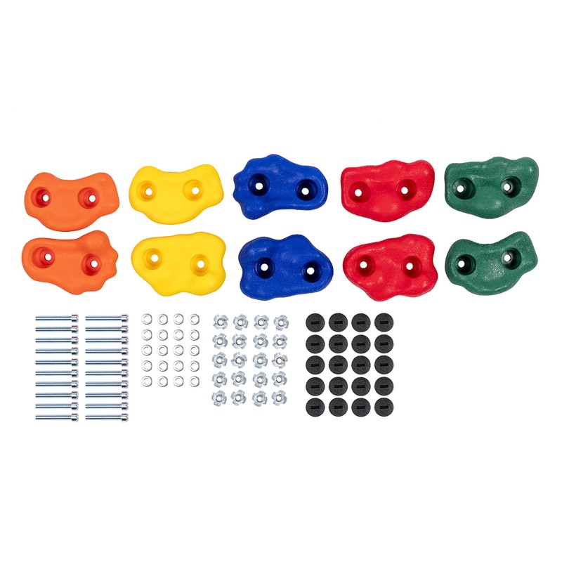 - DETAILS: 10 rock climbing holds in assorted shapes and colors - 1.5" Bolts, T-Nuts, Washers, instructions & 3/16"Allen wrench. Weather resistant plastic and zinc plated hardware for indoor or outdoor use. Boys & girls age 3 & up.