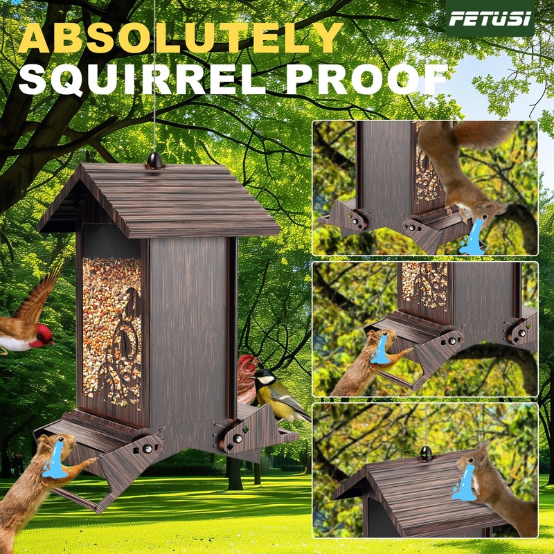 - Bronze Colored: This color of the squirrel proof bird feeder is unique to FETUSI,enhanced the material provides protection against weather conditions.The weight-activated design with 14 feeding ports can maximizes but does not completely stops squirrels.