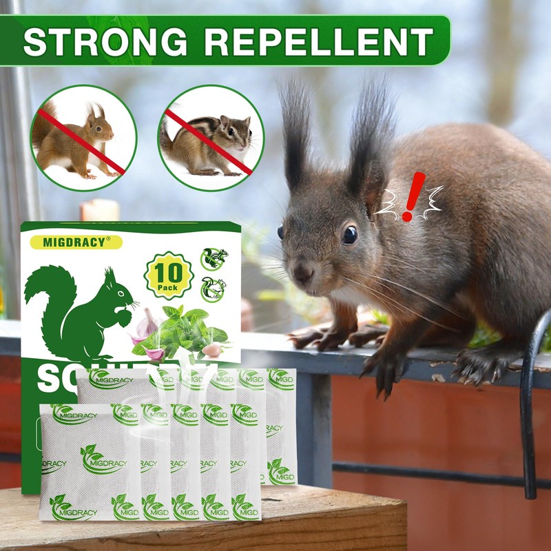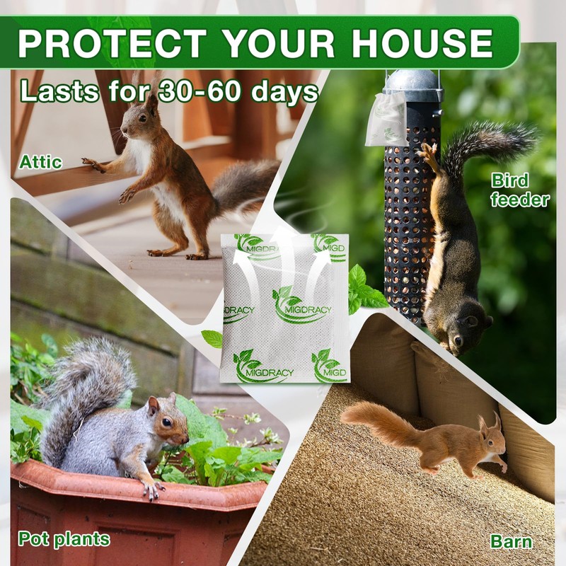 - Squirrels Repellent Pouches: 10Pcs Squirrels repellent pouches contains strong and powerful peppermint oil ingredients. The nice odor can last about 30-60 days and is effective and naturally repel Squirrels invading your Farm.