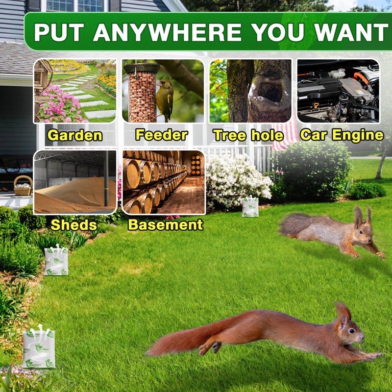 - Easy to Use: Just take the squirrel repellent pouches out of the packaging, put it into the small textile bag, and hang it or place it wherever you need to repel squirrels. You can adjust the number of squirrels repellent pouches according to the size of the space.