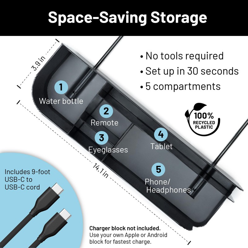 - ONLY CADDY WITH USB-C & USB-A PORTS: No more stretching for far-away devices! Our two built-in charging ports for USB-C and USB-A iPhone, Android, & other devices keep your electronics fully charged and always in grabbing distance. Wall charger block sold separately. For optimal results and faster charging, use an Apple or Android branded wall block.