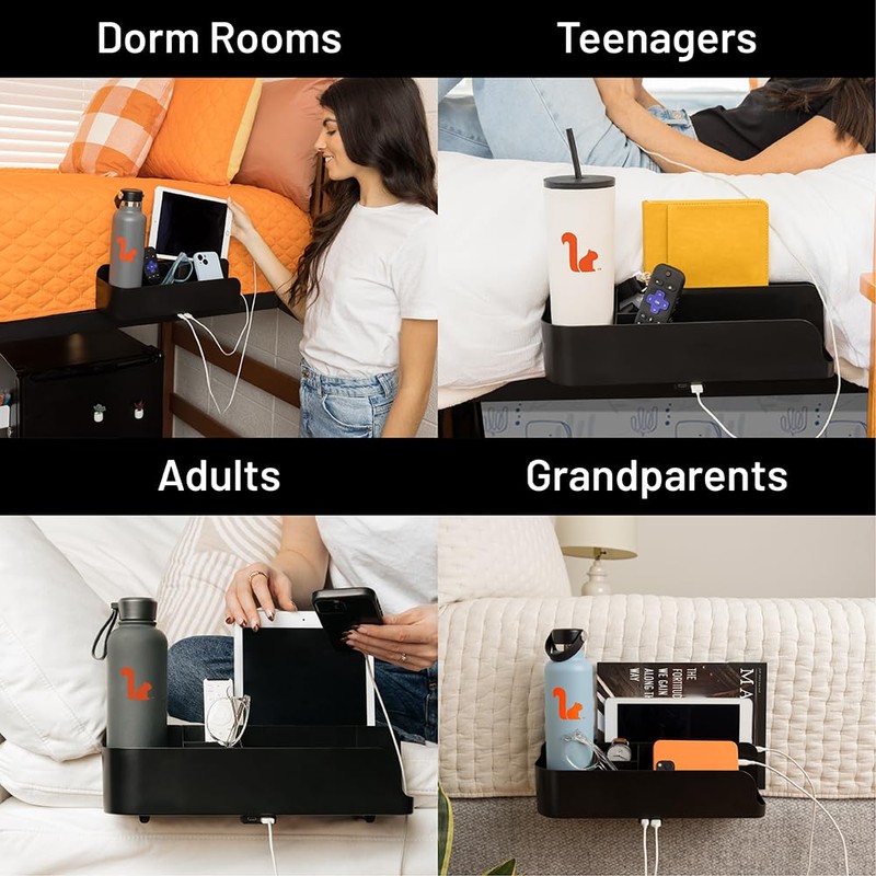 - SMALL SPACE & DORM ROOM FRIENDLY: When you're looking for college essentials, put Squirrel at the top of your list. The Bedside Perch is perfect for small or shared spaces and it's not just for beds! Whether your dorm room needs a bunk bed caddy or your couch needs an organization buddy, we got you covered.