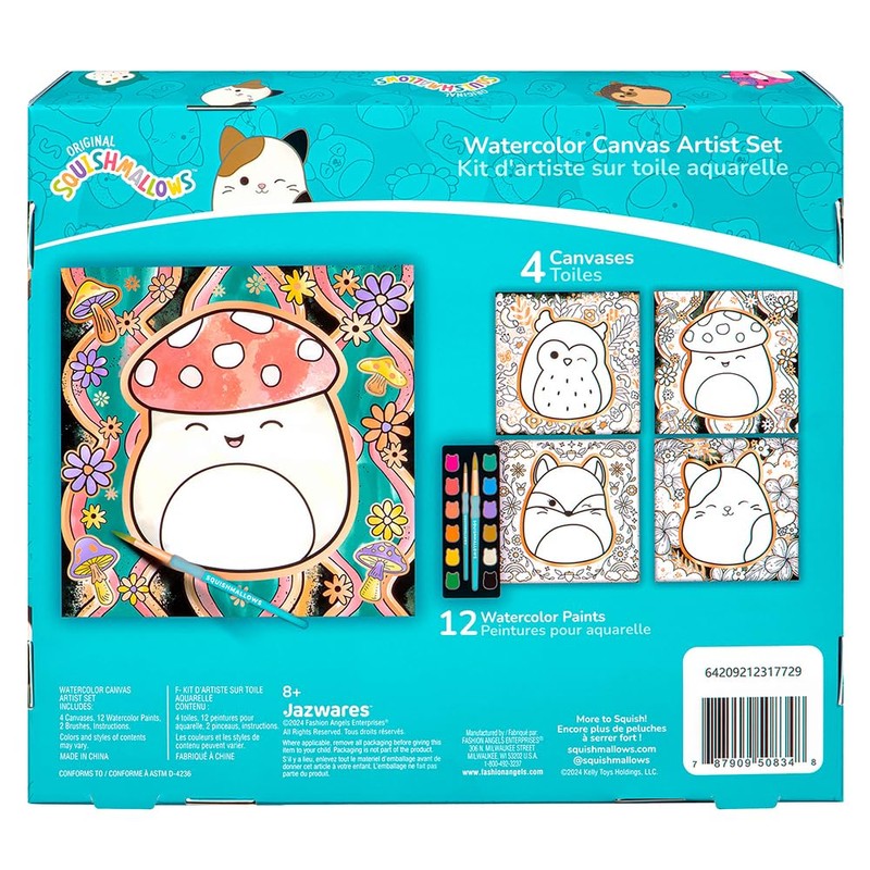 - Color in your masterpiece with this Squishmallows Watercolor Paint & Canvas Set. Each canvas in this set depicts a ready to be painted character and background with rose gold foil accents. Included in the set is a helpful instruction pamphlet that introduces painting techniques, color mixing, and color theory. Use this kit for a fun family activity, or practice painting on all four canvases yourself!