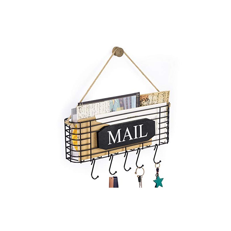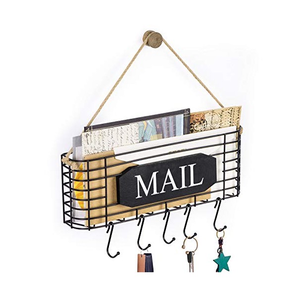 SRIWATANA Rustic Mail Key Holder, Mail Organizer Wall Mount with 5 Hooks Large, Black