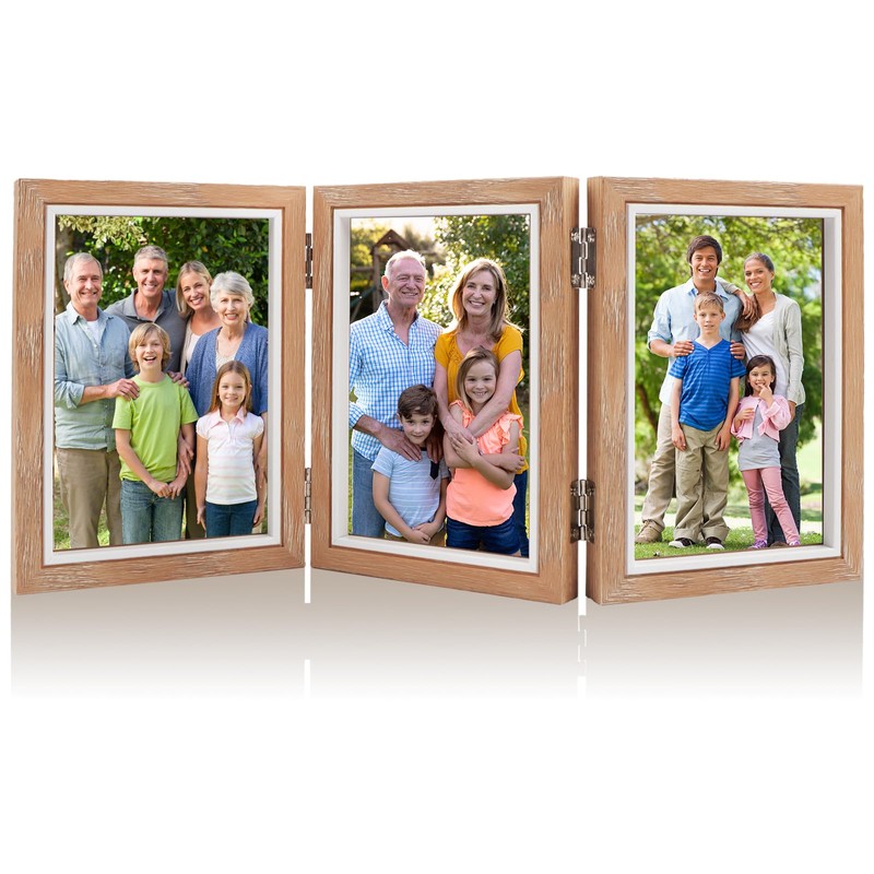 SRunDe Picture Frame for 3 Photos Collage 10 x 15 cm Tri-Fold Desk Frame Folding Wood Colour for Family Friend Gift and Office Decoration