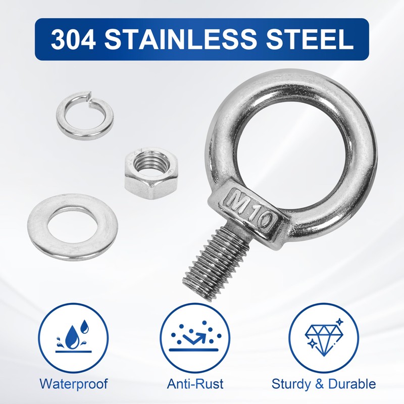 • Included (4 sets total) : you will get 4 pcs of Eye bolts, 4 pcs of hex nuts, 4 pcs of flat washers and 4 pcs of spring washers, Complete Hardware Set for immediate use.