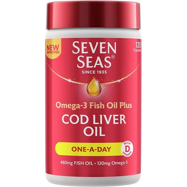 - SEVEN SEAS IMPROVED ONE A DAY FORMULA contains 230 mg of Fish Oil and 250 mg Cod Liver Oil combined, a source of Omega-3 which helps support the health of your heart, brain and vision, It also includes the UK Government recommended level of vitamin D (10µg) to help support your immune system, These capsules contain 120 mg of Omega-3 and now, even higher levels of EPA and DHA