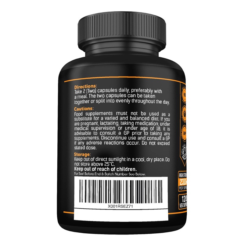 Directions: Take 2 (Two) Capsule daily, preferably with a meal. Cautions: Food supplements must not be used as a substitute for a varied and balanced diet. If you are pregnant, lactating, taking medication, under medical supervision or under age of 18, it is advisable to consult a GP prior to taking any supplements. Discontinue use and consult a GP if any adverse reactions occur. Do not exceed stated dose. Storage: Keep out of direct sunlight in a cool, dry place. Keep out of reach of children.