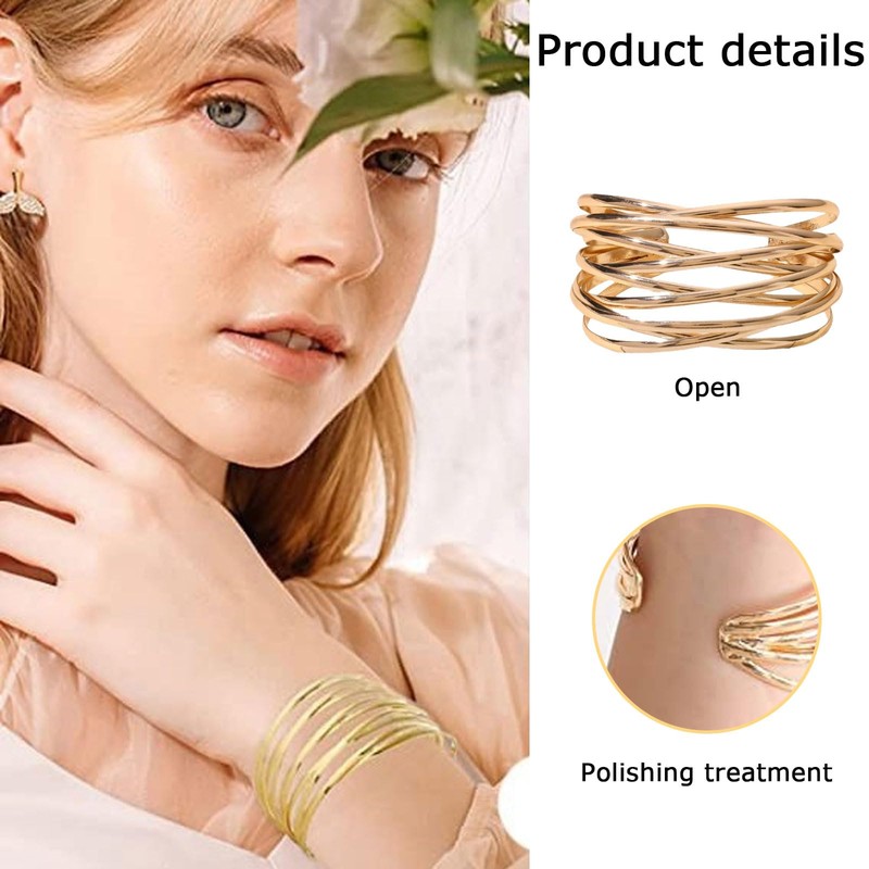 SSKHE Gold Bangles, Chunky Adjustable Gold Bracelet for Women, Multi-layer Cross Wire Gold Cuff Bracelet for Women