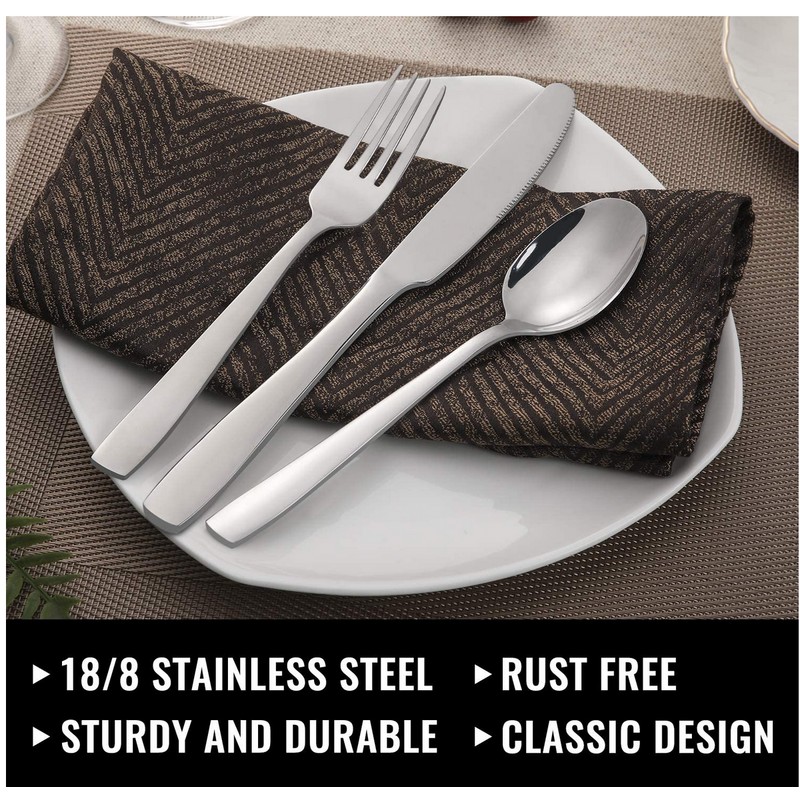 - MODERN AND CRAFTED: Contemporary design with square edge ends, ergonomically designed handle and proper weight provide a comfortable grip for both adults and children. Simple look, stylish and elegant appearance match all of your existing dinnerware or tableware. Mirror polish surface keep shiny. Specially designed sharp serrated dinner knives’ blades for cutting foods and meat thoroughly.