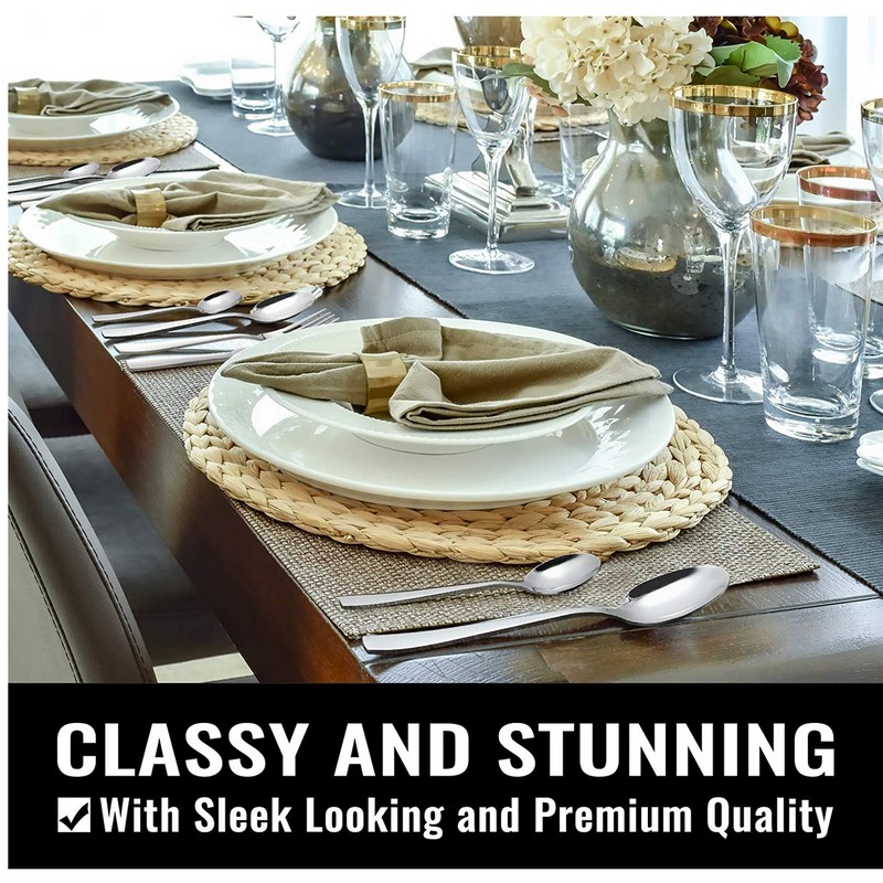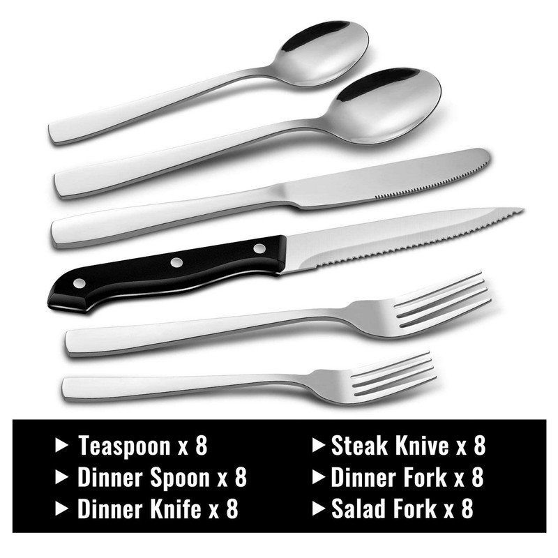 - SILVERWARE SET: 48 piece flatware set, service for 8. Including 8 dinner knives, 8 dinner forks, 8 dinner spoons, 8 teaspoons, 8 salad forks and 8 Steak Knives. Proper size weight and good quality for all family, not only meets the dining needs, but also makes the table setting elegant.