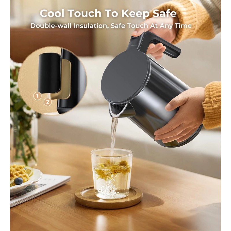 【Cool Touch】With a double-wall design, our electric tea kettle's exterior remains cool to the touch, ensuring worry-free usage and utmost safety.