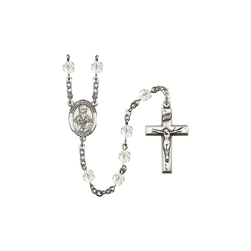 Silver-Plated Rosary 6mm April Crystal Fire Polished Beads, Crucifix Size 1 3/8 x 3/4. St. Alexander Sauli medal charm