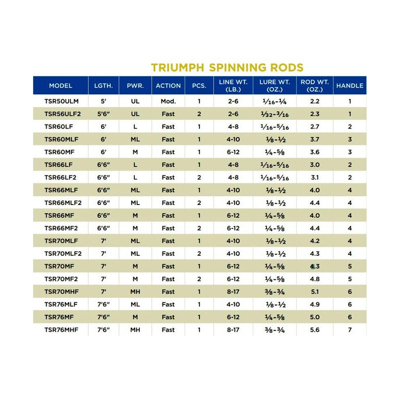 • SPECIFICATIONS: Length – 6’0”; Power – L; Action – Fast; Pieces – 1; Line Wt. – 4-8 lbs; Lure Wt. – 1/16-5/16 oz; Rod Wt. – 2.7 oz; Handle - 2