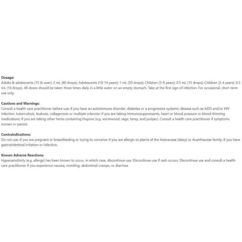 Adults & adolescents (15 & over): 2 mL (60 drops); Adolescents (10-14 years): 1 mL (30 drops); Children (5-9 years): 0.5 mL (15 drops); Children (2-4 years): 0.3 mL (10 drops). All doses should be taken three times daily in a little water on an empty stomach. Take at the first sign of infection. For occasional, short term use only.