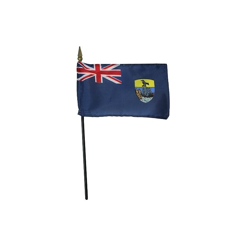 Our 4" x 6" St. Helena stick flags are made from a high quality, silk-like polyester fabric. They feature a hemmed flag mounted on a black plastic 10 inch staff with a gilded spear point. These versatile stick flags can be used on tabletops and desks, to wave in parades, or to decorate flower arrangements.