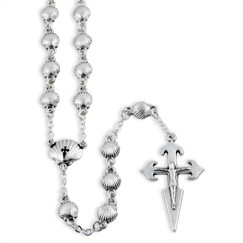 • This great Rosary has metal shell beads The large seashell center has a carving of the St. James Crucifix on the front with the image of St. James on the reverse.