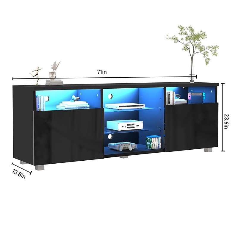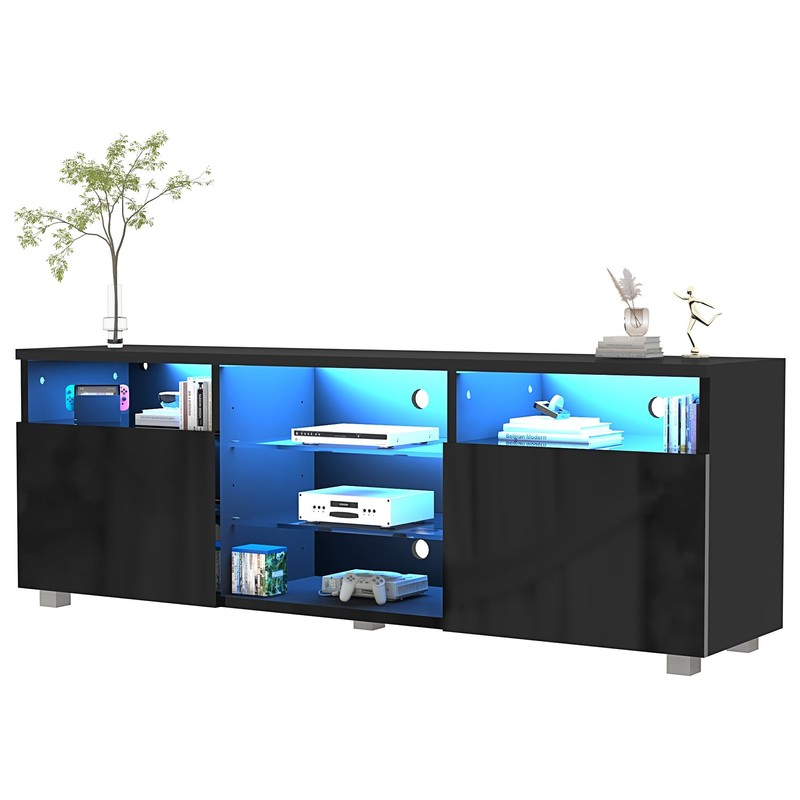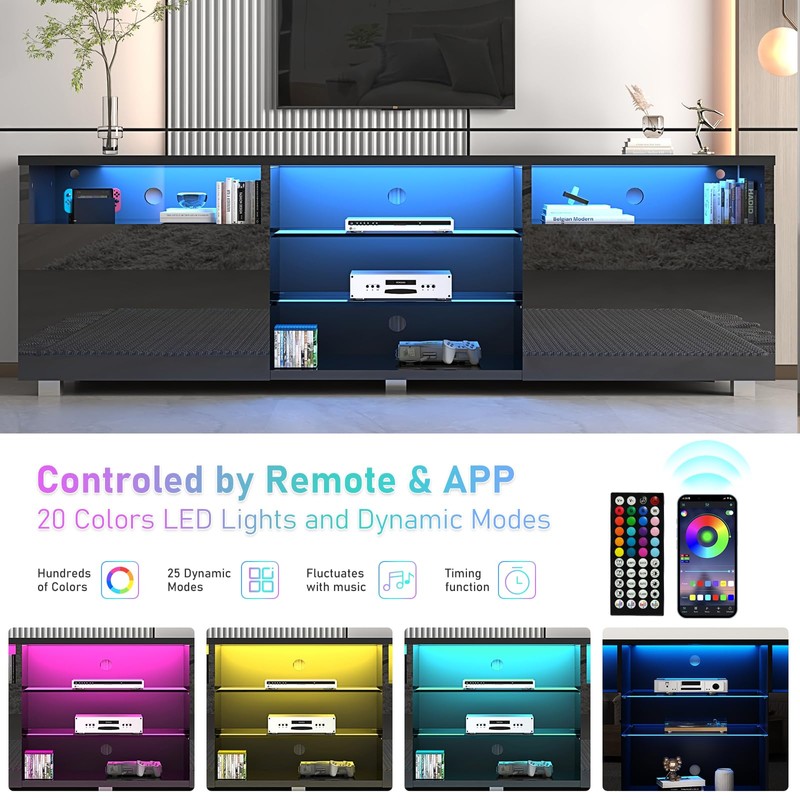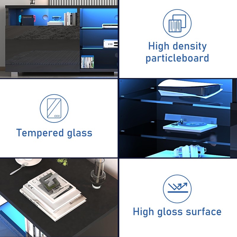 【LED TV Stand】High-hardness particleboard + tempered glass, using a smooth paint process, while ensuring firmness and permeability, it is very beautiful and practical. 【 Adjustable LED Remote System】Equipped with remote control, features 20 colors of RGB LED lights and 8 flash effects. This LED lights system is controlled by remote control to switch ON/OFF or change dynamic effects, decorating your home colorful and beautiful. 【5-Level Height-Adjustable Shelves】The 3 tempered glass shelves can be adjusted with 5 height levels. Gaming TV stand with large storage can be used to store game consoles, media, magazines, DVDs, remote controls and decorative ornaments. Make full use of the space, keep your living room clean and tidy, and prevent you from missing items. 【Modern Style】Simple high gloss fronts and matte texture body make this tv stand both exclusive and . Adds a modern touch to most home decorations. 【Easy Assembly 】All hardware is included for stress-free assembly. According to the manual, the items can be easily integrated.