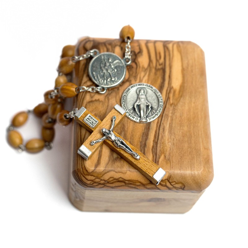 - - Olive Wood Rosary and Box Gift Set, with St. Michael medal, the patron of the military and police forces