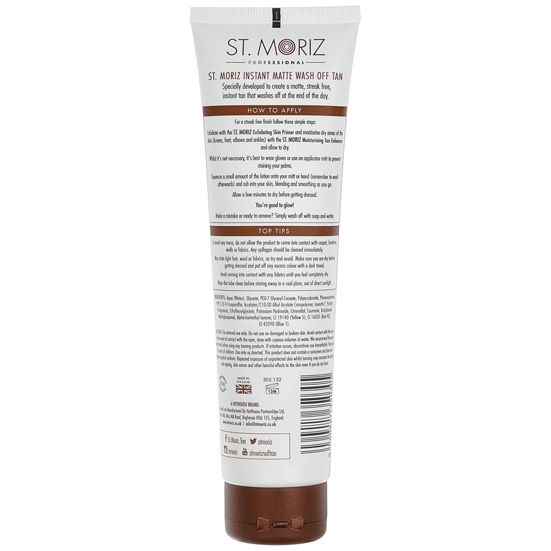 - St. Moriz Professional Wash Off Body Tan immediately gives a natural and healthy complexion that you can easily wash off at the end of the day in the shower.
