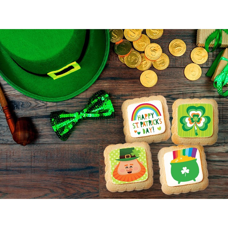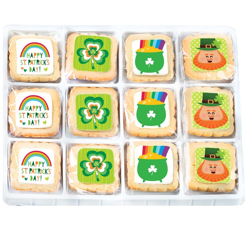 - ☘️ 12 Delicious St Patrick Themed Sugar cookies with Vanilla Frosting, printed with edible ink. Individually Wrapped.