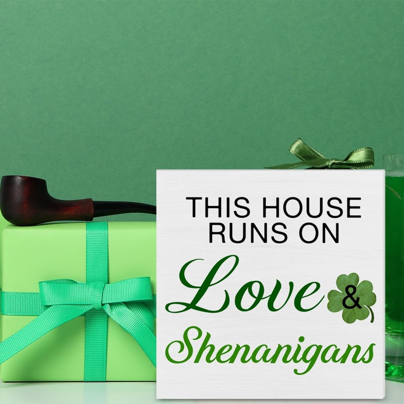St. Patrick's Day Decorations, This House Runs on Love and Shenanigans Wooden Block Sign, Shamrock Decorations, St. Patrick's Day Home Decor for Desk Table Shelf, 5 X 5 Inches