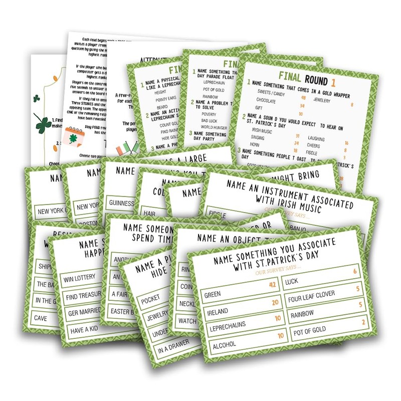 - This is a St. Patrick's Day theme of the classic friendly feud game! Includes 3 game instruction cards + 12 question moderator cards and 3 quick final rounds game cards.