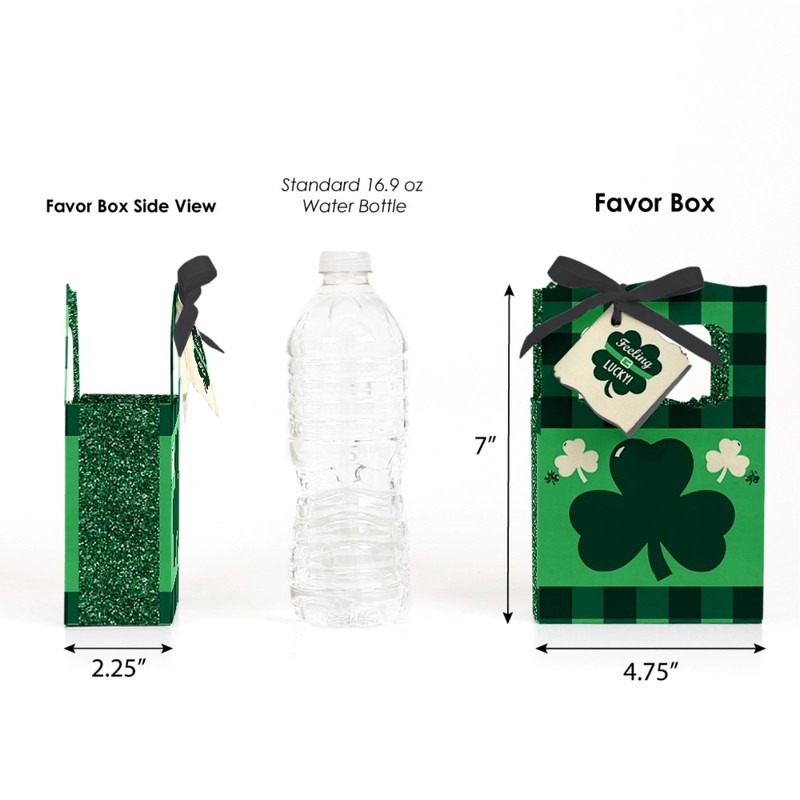 - St. Patrick's Day Party Favor Boxes SIZE 4.75 inches wide x 4.75 inches high x 2.25 inches deep (fillable inside space) with a total height of 7 inches, including the handle. The coordinating gift tags and ribbon makes these 12 shamrock party favor boxes a complete treat bag party kit that everyone will love.
