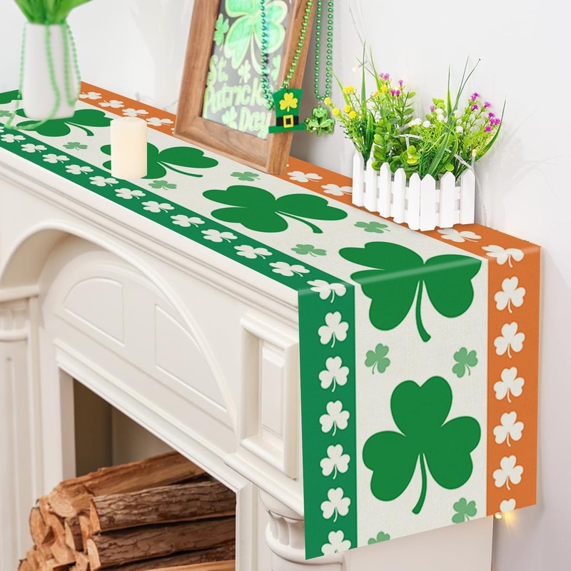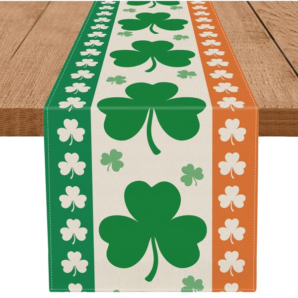 St. Patrick's Day Table Runner Shamrock Green and Orange Stripe Table Decorations Holiday Spring Kitchen Dining Home Party Supply 13x36 Inch