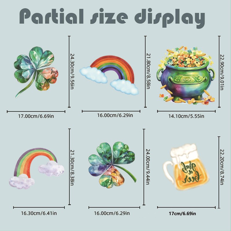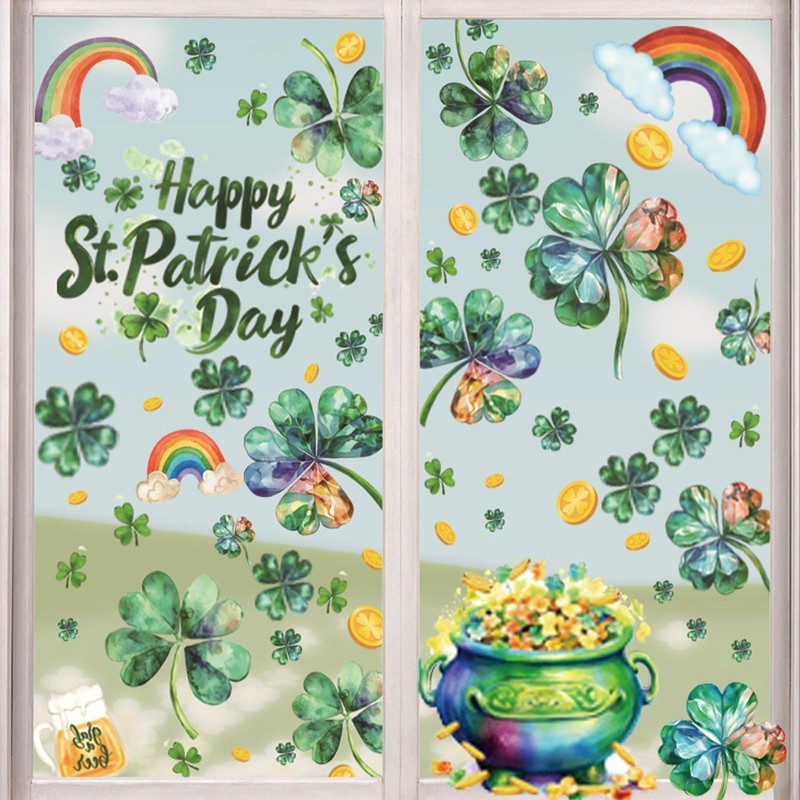 - FESTIVE DESIGN: Beautiful St. Patrick's Day window decorations featuring watercolor shamrocks, rainbows, gold coins, and a pot of gold against a soft blue background