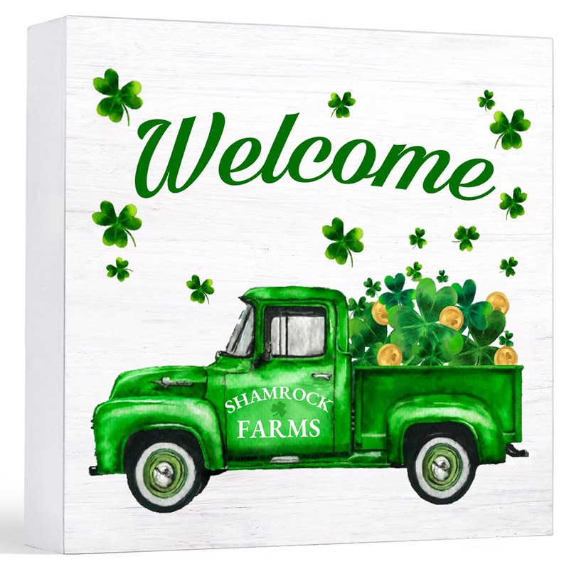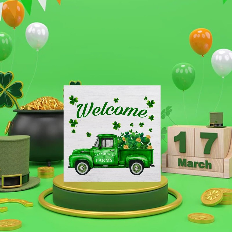 St. Patricks Day Decor Welcome Sign Shamrock Farms Truck Wood Sign Home Desk Tabletop Shelf Decor, St Patricks Day Decorations 5 x 5 Inches