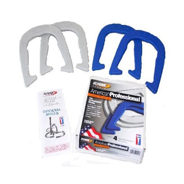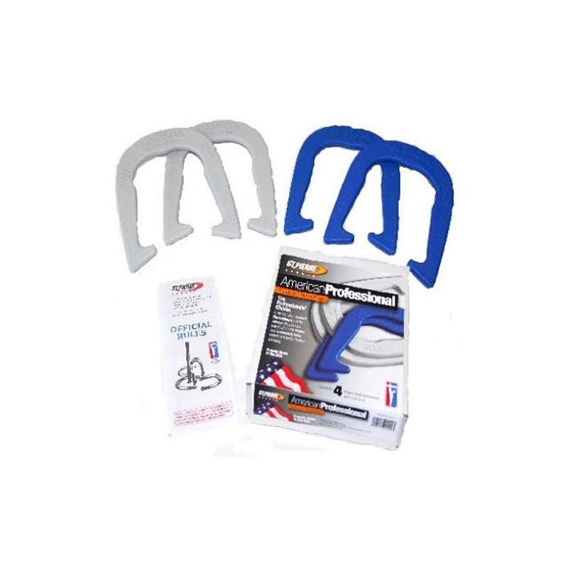 Drop-forged, solid steel American balanced horseshoes. Official size and weight. NHPA approved for tournament play. Four American horseshoes, NO stakes. Official rules and court layout instructions included.