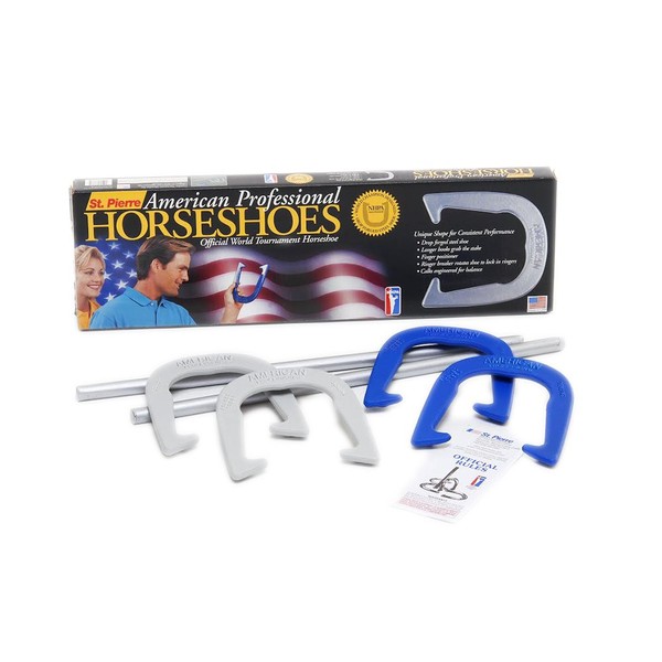 - Included components: (2) Blue Shoes, (2) Gray Shoes, (2) Solid Steel Stakes, Official Rulebook with court layout, Durable, Nylon Tote Bag.